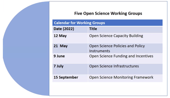 Dr. Ana Persic also added to the dialogue by highlighting the need for awareness raising on open science, open science financing, and a strong monitoring framework for the recommendation. Among the activities planned as part of the implementation agenda are developing a series of supporting tools such as technical briefs, mapping existing open science policies, collecting best practices, analysing finance mechanisms, building capacity and developing an open science monitoring framework. There will be a DG’s OS steering committee for implementation of the recommendation. In addition, a global open science partnership was created in 2020 to provide inputs in the process of development of the recommendation. Five Open Science Working Groups will also be created with a calendar as given in the below picture:
