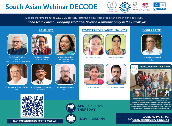 The UNESCO Chair in Community-Based Research and Social Responsibility in Higher Education is organising a webinar, "Decolonized, Community-Led Co-Construction of Knowledge Towards Climate Resilience," on April 3, 2025 (Thursday), from 11:00 AM – 12:30 PM (IST). This session, part of the DECODE Project, will explore how diverse knowledge systems shape climate action. Hear insights from the Indian case study, "Food from Forest – Bridging Tradition, Science, and Sustainability in the Himalayas," where community leaders and researchers will share how collaborative knowledge can address the climate crisis.