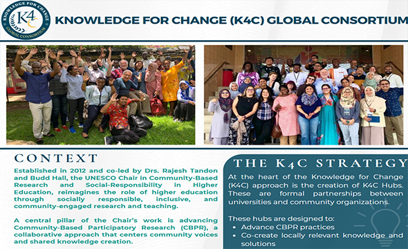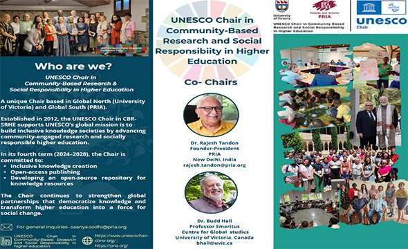 The UNESCO Chair in Community-Based Research and Social Responsibility in Higher Education (CBRSRHE) was established in 2012 under the Co-Chairs, Dr. Budd L Hall and Dr. Rajesh Tandon. Based at the University of Victoria (UVic), Canada, and the PRIA, New Delhi, India, the Chair is a unique partnership between a University in the Global North and a practitioner institution in the Global South, with a focus on community-based research (CBR) and socially responsible higher education.