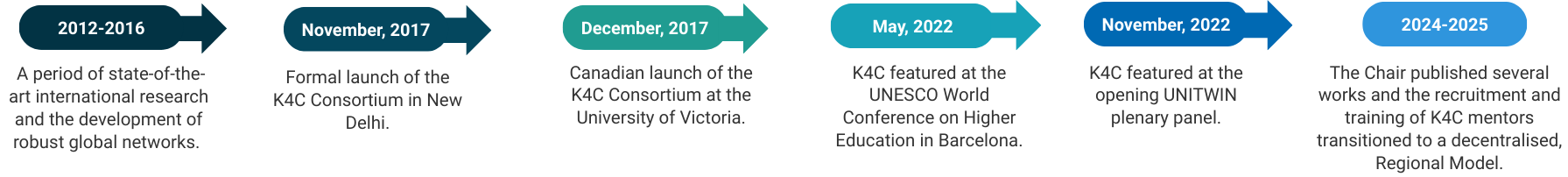 The Knowledge for Change (K4C) Global Consortium for Training in Community-Based Participatory Research was created during the UNESCO Chair’s second term (2016-2020). The formal launch of the K4C Consortium took place on 13 November 2017 in New Delhi, in collaboration with the UNESCO New Delhi Office and the Indian Association for Universities. The Canadian launch occurred subsequently in December 2017, with joint efforts from the University of Victoria and the Canadian Commission for UNESCO.