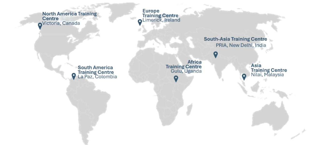 In 2024, the Chair opted to transition the recruitment and training of K4C mentors from a centralized UVic-PRIA model to a regional approach. Since its launch in 2017, the K4C’s cost-effective, high-impact model has trained 160 mentors in 9 cohorts across 24 hubs. The mentors have then gone on to create these local and regional K4C hubs in 16 countries, including Canada, Cuba, Colombia, India, Indonesia, Ireland, Italy, Malaysia, South Africa, Tanzania and Uganda.
